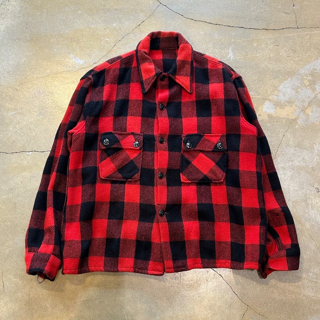 buffalo check jacket 赤×黒の王道バッファローチェック。 裾がラウンドタイプの個体が多い中、 こちらは珍しいボックスシルエット。 身幅も広めで、シャツとしてはもちろん ライトアウター感覚での着用も◎ 無骨さとバランスの良さが光る一着です。 クラシックな配色だからこそ、 デニムやワークパンツとの相性は言わずもがな。 ヴィンテージ好きには刺さるディテール、 お早めにどうぞ。 size: 肩幅53 身幅60 着丈68 袖丈60