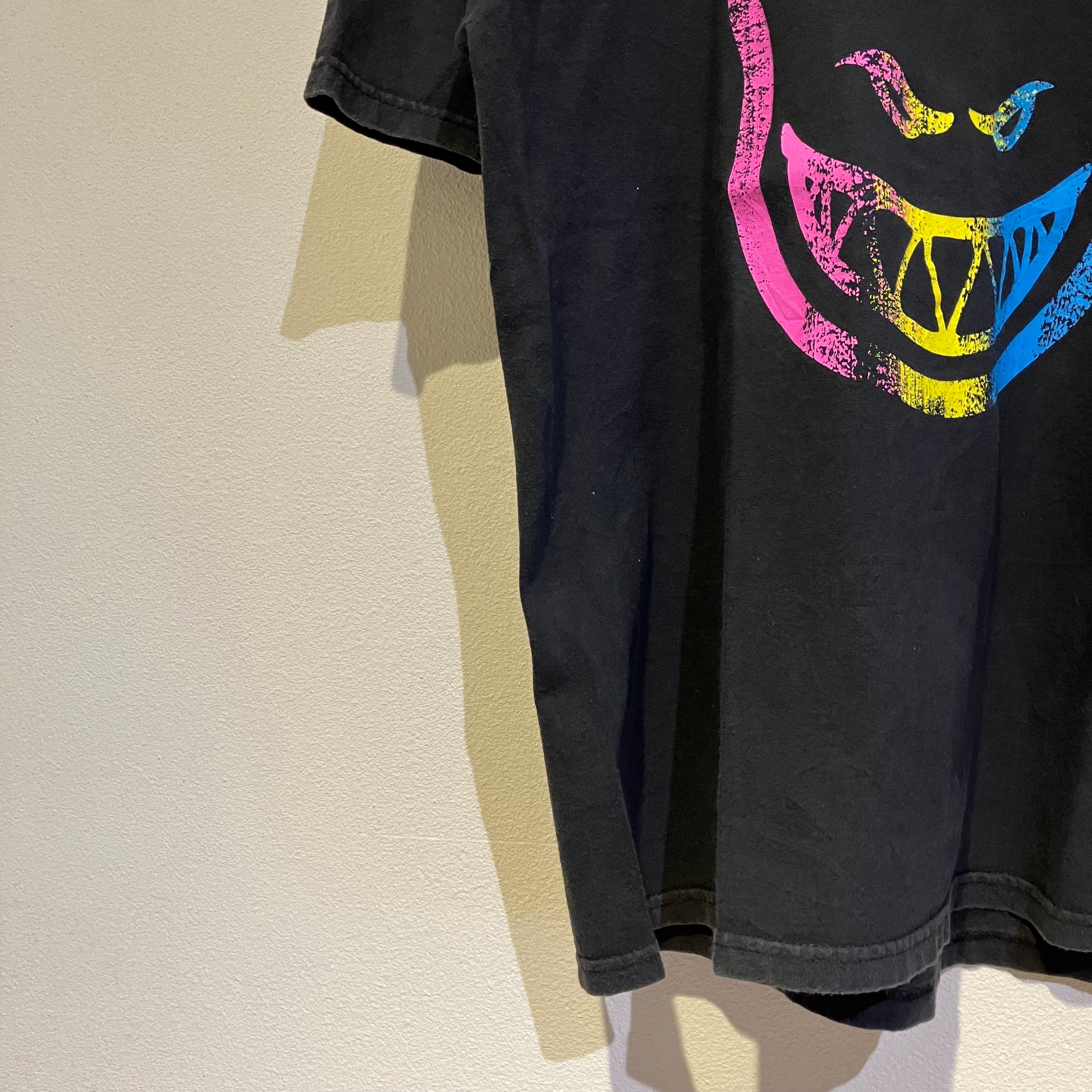 フロントに大胆に落とし込まれたアイコン的グラフィック。ピンク×イエロー×ブルーの配色が、ブラックボディに映える一枚。